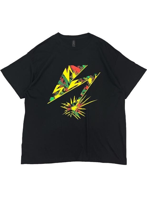 レゲエやダブのエッセンスを加えた独特のサウンドとエネルギーあふれるライブパフォーマンスで多大なリスペクトを集める彼らのシンボルの稲妻パターンをカラフルに組み合わせたカモフラ柄の特大の稲妻をプリントした1着です。