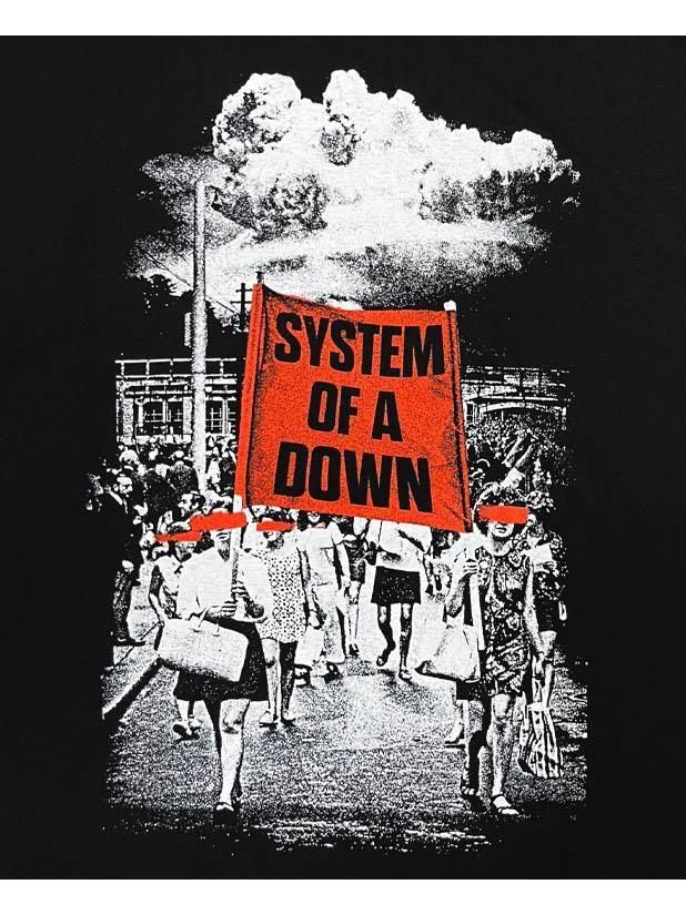 女性解放運動のフォトの横断幕のメッセージをバンド名にアレンジした、社会的メッッセージが込められたSYSTEM OF A DOWNらしい1着です。